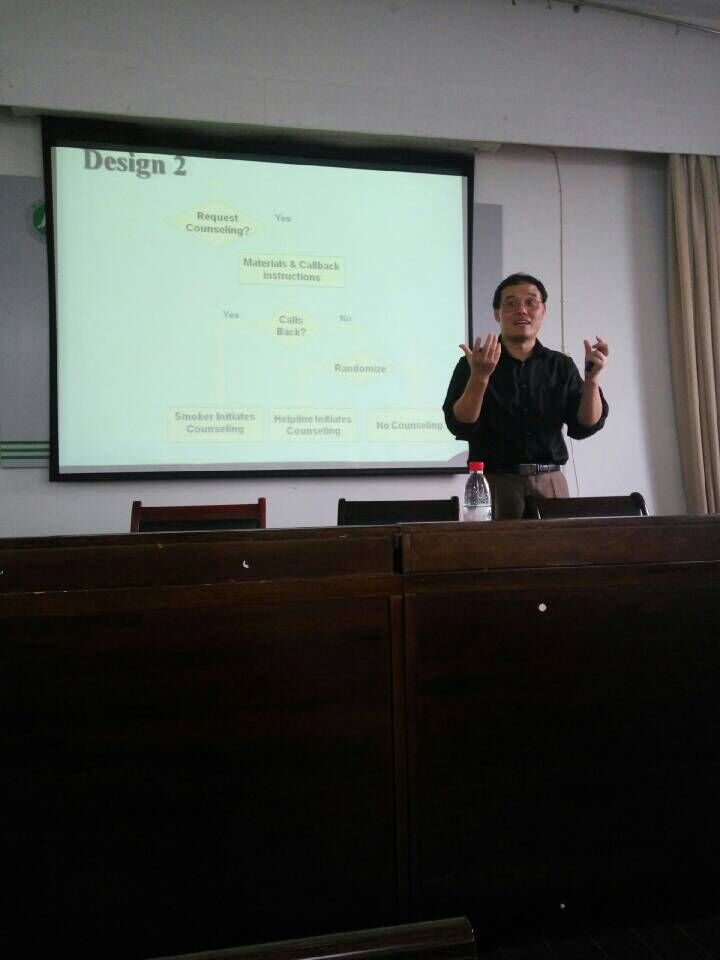 讲座伊始,朱书宏教授用个人美国求学经历引入其为何开展戒烟热线研究。随后朱书宏教授向大家展示了美国政府与各州立政府受其戒烟热线研究影响在各州最后乃至全美开设戒烟热线服务。之后,朱书宏教授向大家详细介绍其戒烟热线研究中两项经典研究设计。第一项研究设计验证了戒烟热线能够有效促进吸烟者戒烟,第二项研究验证了戒烟热线的应用具有普适性。朱教授对两项研究的讲解使得在座师生理解了戒烟热线研究的巨大价值。但朱教授也提到在做该项目时所遇到的种种困难与不易,这些挫折也促使朱教授对其研究更进益求精。最后朱书宏教授与师生们进行了问答互动,解答了师生们的问题。所有师生以热烈的掌声表示对朱书宏教授的感谢!