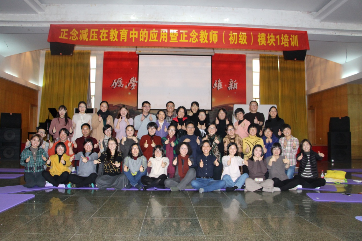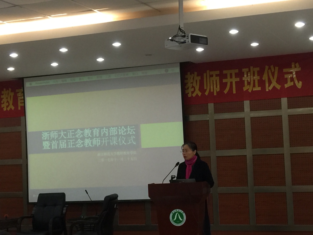 2017年11月25日-11月30日,由浙师大教师教育学院主办的“正念减压技术在教育教学中的应用”暨“正念教师”初阶培训工作坊,在我校举行。工作坊由来自台湾法鼓文理学院的温宗堃、我校正念研究实验室主任宋晓兰以及浙江科技学院的王艳明带领。这是正念训练系统在我省乃至全国首次进入基础教育领域,是将正念训练引入教师发展培训及校园文化建设的大胆尝试。工作坊受到了受训教师的一致好评,大家纷纷表示,这种有别于传统的认知式学习的体验式学习,对个人和工作的帮助非常大,有助人情绪管理、平衡家庭-工作冲突,以及在工作中真诚友善地处理同事关系及师生关系;并且,非常有必要将正念训练带入课堂教学以帮助提高学生的学习效率和情绪管理。