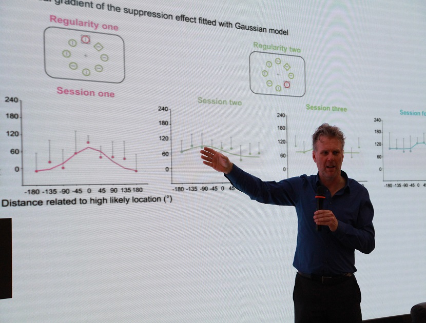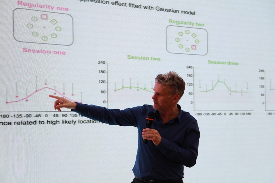 讲座中,Jan Theeuwes 教授形象地阐述了内隐规则学习影响视觉选择的研究。他指出传统研究普遍认为人类视觉注意受自上而下的行为目标以及自下而上的刺激属性同时影响。而近期的研究发现,人类的视觉选择经验也同样会影响人的视觉选择过程,它会快速,灵活,并持续影响视觉选择中的注意分配。据此,Jan Theeuwes 教授围绕视觉干扰物的出现规律如何影响视觉选择展开了系列研究。研究发现,通过内隐的学习哪一个位置更容易出现干扰物,通过抑制该位置,个体能更少受到干扰影响,并更快的搜索出目标。更近一步的研究发现,仅仅通过极少的训练,个体就能学习到这种规则或改变已经学习到的规则,甚至在没意识到规则的情况下,这种规则依然会产生影响。