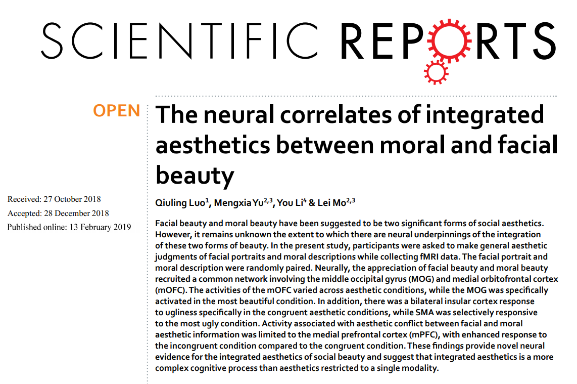 Luo, Q., Yu, M., Li, Y., & Mo, L. (2019). The neural correlates of integrated aesthetics between moral and facial beauty. Scientific reports, 9(1), 1980.