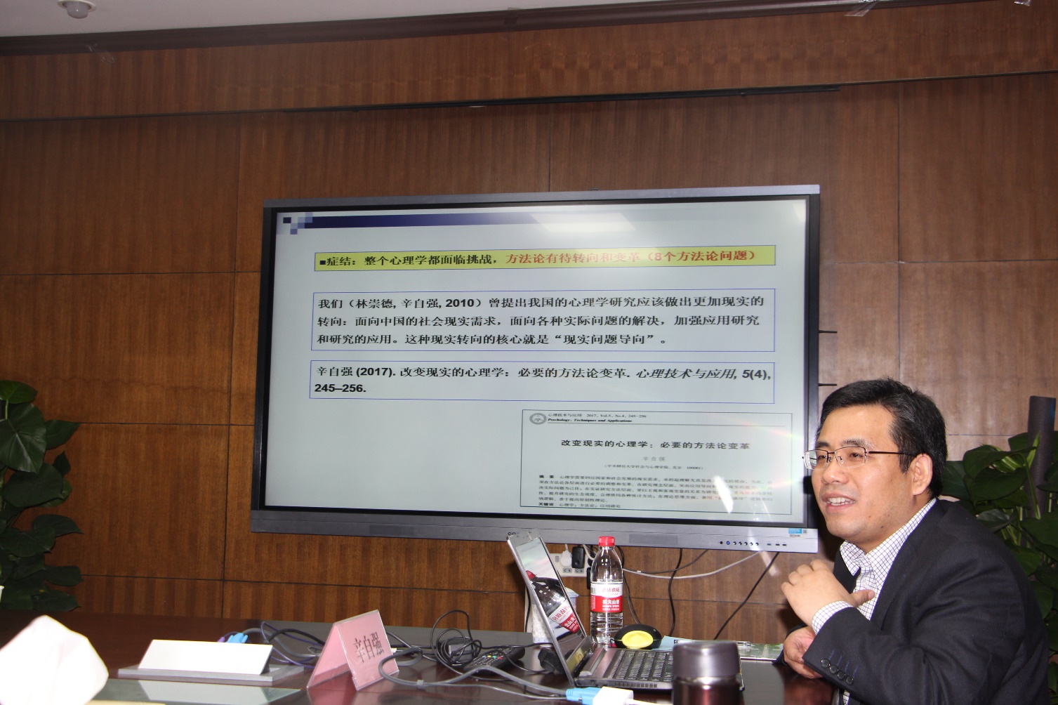 2019年3月31日,中央财经大学社会与全讯600cc大白菜官网院长辛自强教授给我系师生作了《面向现实的心理学方法论变革》学术报告。辛教授从心理学的方法论出发,提出心理学需要回应国家和社会发展的现实需求,承担起理解尤其是改善现实的使命,必须在方法论各层面进行必要的调整和变革。