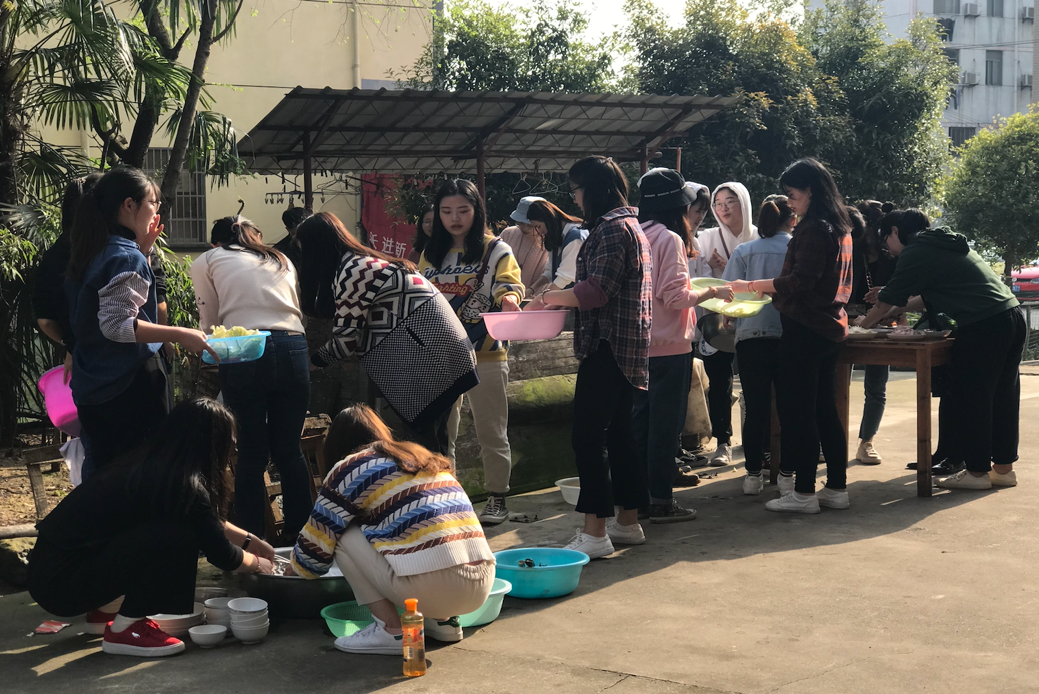 游戏环节结束以后,“厨神争霸”活动便正式开展了。各小组带上要烹饪的菜的原料,一起去预定的地点进行自炊。一到场地,大家便忙活开了,各小组分工协作,大展身手,屋里屋外热火朝天。厨神们的辛勤烹饪与助手们的鼎力协助最终让我们邂逅了一场美食的盛宴:酸菜鱼、红烧肉、回锅肉、大盘鸡……香味在鼻尖萦绕,美味在唇齿留香。