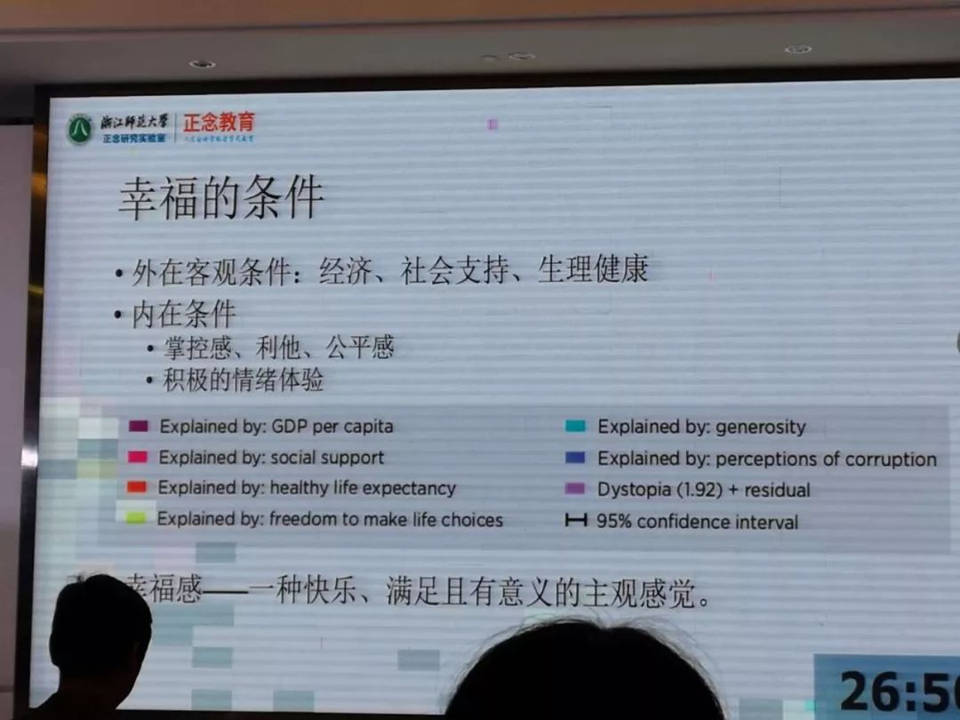 接着,宋晓兰博士讨论了幸福产生的条件,这个条件可以粗略的分为客观条件和主观条件。外在客观条件:经济、社会支持、生理健康;内在条件:掌控感,利他、公平感、积极的情绪体验。并阐释了正念与幸福的天然联系:正念是把幸福由一个终点目标变成一个踏踏实实在过程中就可以去体验到的一种方法。