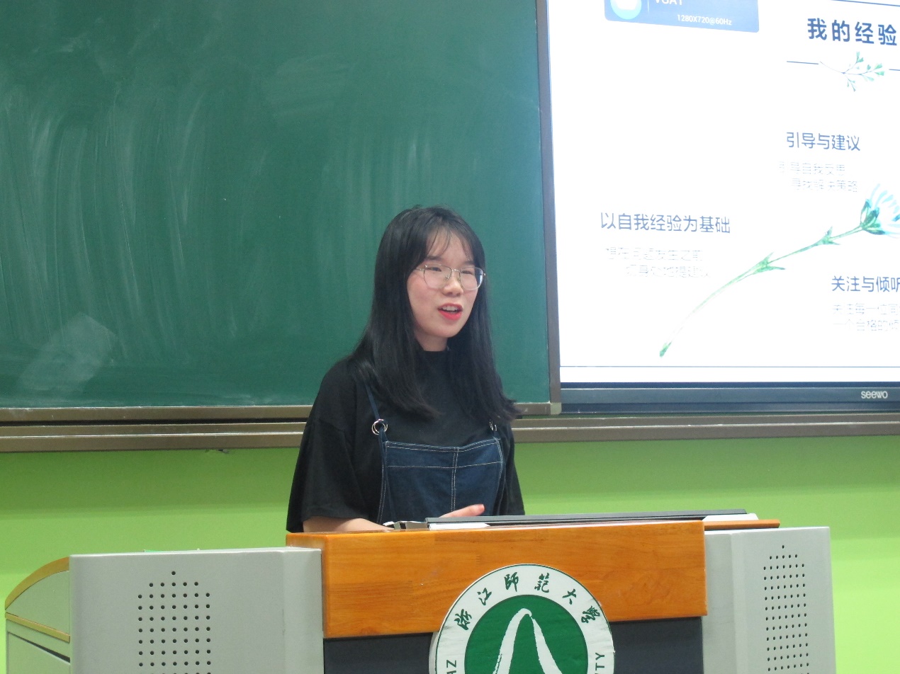 针对同学生活困扰提出建议,参与寝室会议调节内部矛盾,小教161班的黄越以具体案例为材料,分享了她的朋辈工作经验。作为“新生与浙师大的桥梁”,心理162班师妍在新生始业阶段不厌其烦地为小班同学答疑解惑,提供生活、学业等多方面参考经验。