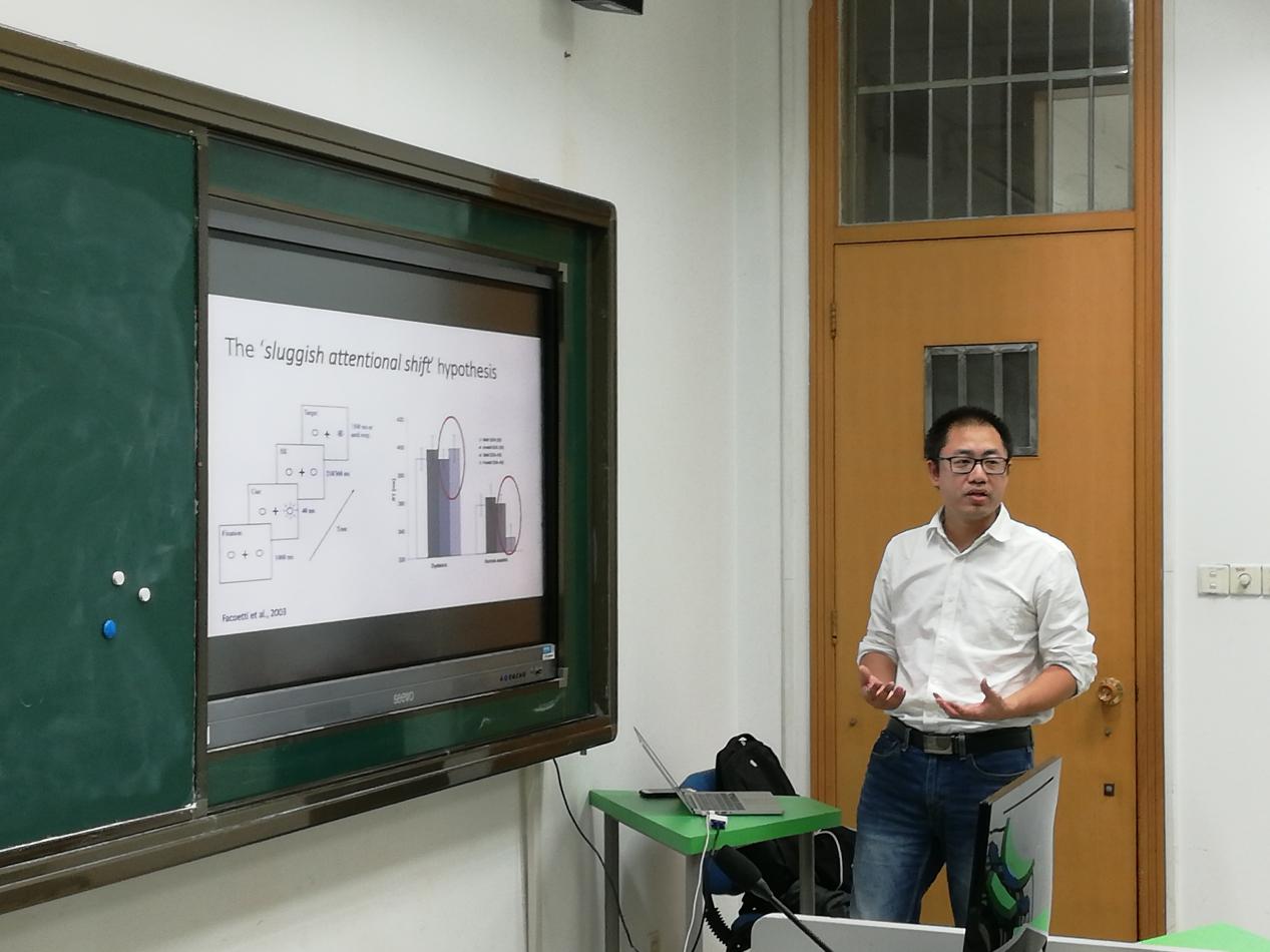 王治国博士的讲座共分为两个模块,第一部分介绍了他近期的实验研究:汉语阅读以及数学学习障碍儿童的注意缺陷。首先他阐明了阅读障碍和阅读困难的涵义,引出“注意力转移迟缓”假说,为大家展示了其阅读障碍儿童注意缺陷的研究以及相关结果。研究发现,阅读和数学学习困难儿童的返回抑制的开始时间延迟,在各种形式的学习障碍中注意力脱离缓慢可能是一种普遍缺陷,而以抑制性控制为目标的训练项目可以有效缓解学习障碍儿童的学习困难。第二部分介绍了眼球追踪的方法、范例和应用,从眼动的基本知识入手,用生动的案例呈现应用眼动科学研究的过程。