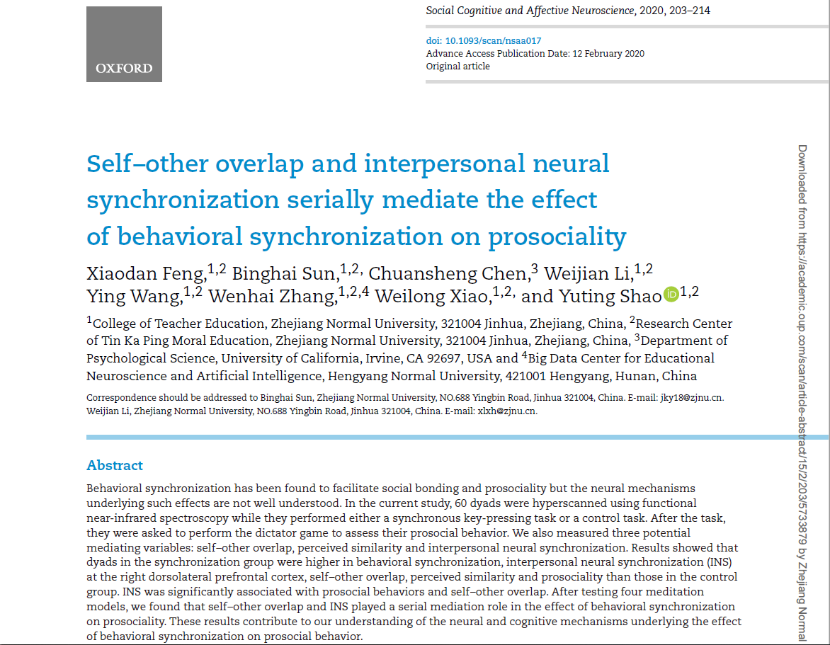 近日,孙炳海教授课题组在社会神经科学领域的权威期刊《Social Cognitive and Affective Neuroscience》上发表题为《Self–other overlap and interpersonal neural synchronization serially mediate the effect of behavioral synchronization on prosociality》的论文。该论文的通讯作者为我系李伟健教授和孙炳海教授,论文还曾多次得到加州大学尔湾分校陈传升教授的指导。