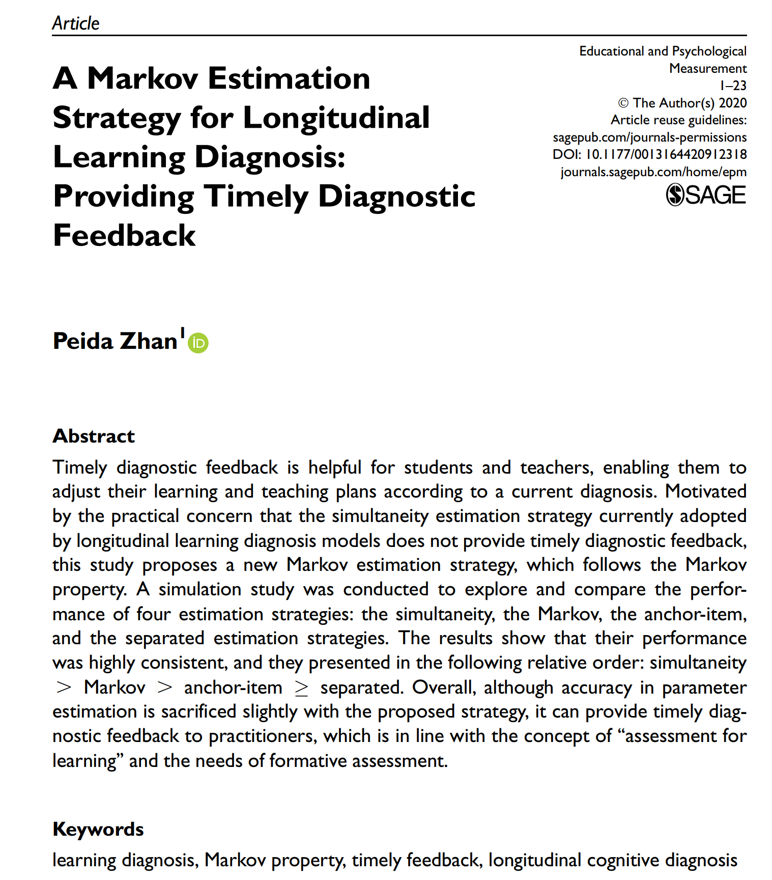 Zhan, P.* (2020). A Markov estimation strategy for longitudinal learning diagnosis: Providing timely diagnostic feedback. Educational and Psychological Measurement. Advanced Online Publication.