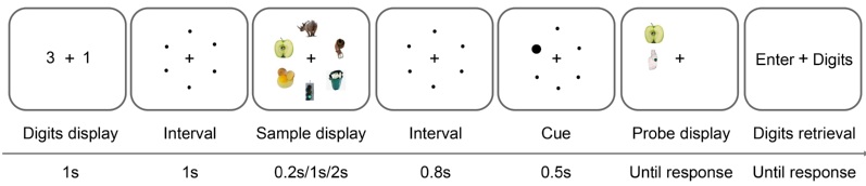 图1. 研究实验范式。被试需要记住屏幕中呈现的视觉物体,并在短暂的消失后做一个二择一的判断选择,判断回溯线索所在位置的视觉物体是上下哪一个。为排除言语工作记忆的影响,被试需要同时执行一个数字保持任务。并且,研究者同时操纵了物体的呈现时间,即编码时间(0.2 / 1/ 2 s)。