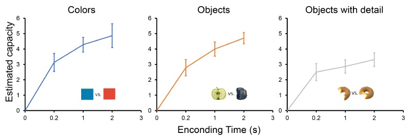 图2. 实验1研究结果。横坐标为编码时间,纵坐标为工作记忆容量(k)。