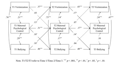 2021年6月,谢瑞波课题组在发展与教育心理学知名期刊《Journal of Interpersonal Violence》 上在线发表题为《Bidirectional Longitudinal Relationships between Maternal Psychological Control and Bullying/Victimization among Father-Absent Left-Behind Children in China》的论文(一作为2019级硕士生吴伟,谢瑞波为通讯作者;文章链接https://doi.org/10.1177/08862605211022062),该期刊为SSCI一区TOP 2 期刊,2020年的影响因子为6.14。该研究采用间隔半年的三次追踪调查研究(T1-T3),通过建构交叉滞后模型,考察了7-11岁父亲外出留守儿童的欺负/受欺负与在家抚养人母亲的心理控制教养之间的双向作用关系。研究发现母亲心理控制教养与父亲外出留守儿童欺负/受欺负存在相互作用。具体来说,T1母亲心理控制可以预测T2儿童受欺负,T2儿童受欺负可以进而预测T3母亲心理控制,形成恶性循环。T1儿童欺负可以预测T2母亲心理控制,T2母亲心理控制进而预测T3儿童欺负,又导致恶性循环。该研究关注中国留守儿童这一特殊群体,对留守儿童家庭教育和校园欺凌干预提供了启示。父母的消极教养与儿童的不良行为具有恶性循环的特征,只有通过家庭教育指导才能打破这一循环,才能促进儿童积极发展。
