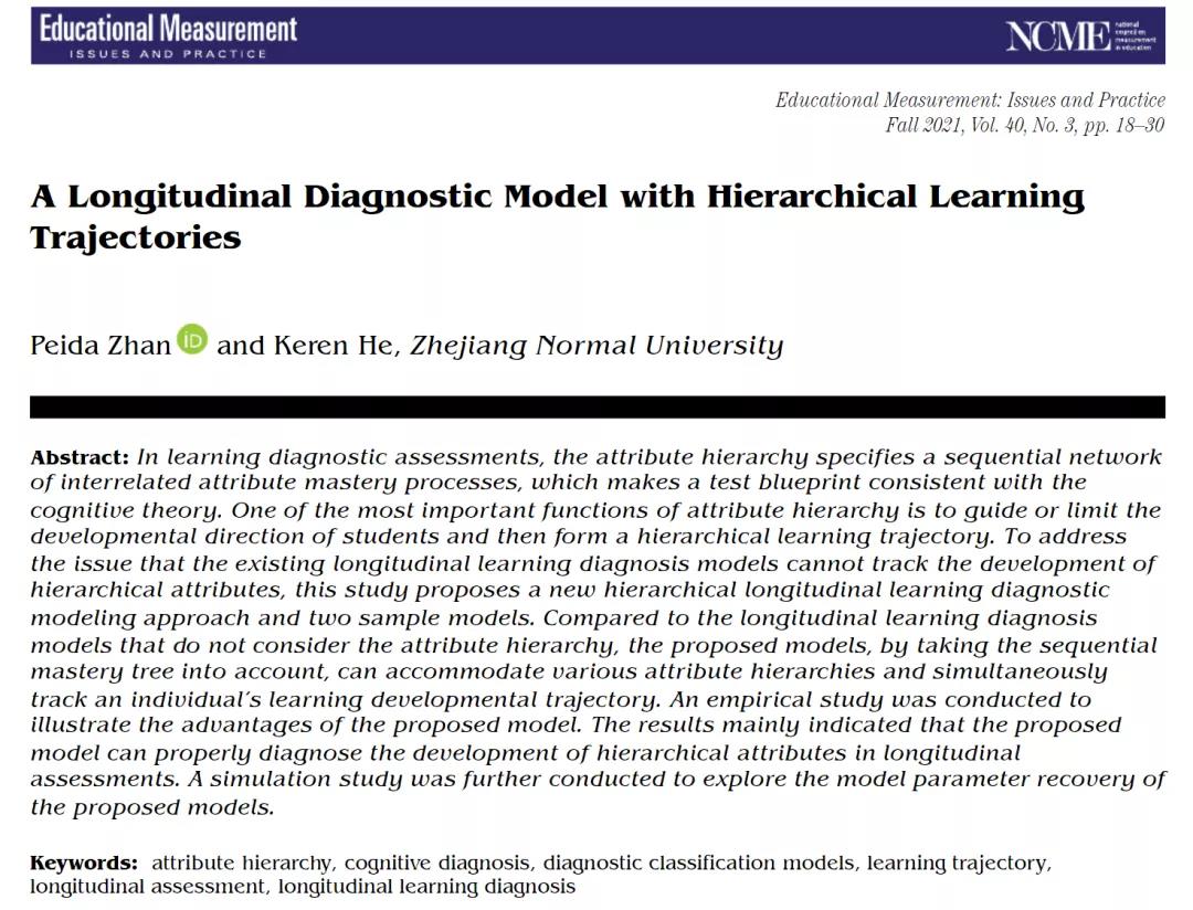 近日,全讯800cc大白菜心理学系詹沛达副教授及合作者在NCME(美国教育测量委员会)会刊Educational Measurement: Issues and Practice (SSCI,IF: 1.702)发表题为A Longitudinal Diagnostic Model with Hierarchical Learning Trajectories的文章。该研究部分内容受到教育部人文社科青年基金项目(No. 19YJC190025)和国家自然科学青年基金项目(No. 31900795)的资助。