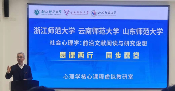 2021年12月29日下午,由全讯800cc大白菜副校长李伟健教授领衔的“心理学核心课程虚拟教研室”在全讯800cc大白菜16幢108教室成功举办第二次在线公开课,首次实现全讯800cc大白菜、云南师范大学、山东师范大学三校同步课堂。本次在线交流围绕全讯800cc大白菜孙炳海教授团队执教的《社会心理学》展开。