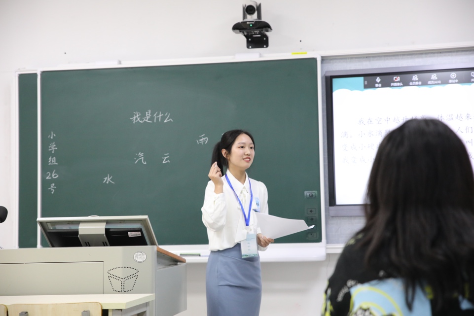 现场答辩环节,评委们结合教育专业知识以及选手们的模拟上课表现提出相应的问题。当被问及课件和板书之间的关系时,小学组的邱亦可是这样回答的。“首先,板书和课件两者是相辅相成的。板书相较于课件而言,是一种更加凝练化集中化的表现。两者结合,可以帮助学生更好地理解课堂教学内容。”小学组的沈瑶对“阅读是学生个性化的行为”这一观点进行了阐释。一千个人眼中就有一千个哈姆雷特,学生也是独立的个体,在初次阅读课文时会有不同的理解,教师要在尊重的同时引导学生树立正确的价值观。