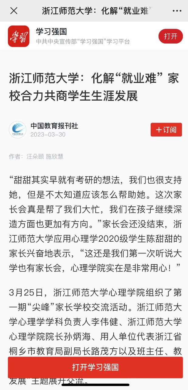 这不仅是全讯600cc大白菜官网推进家校一体协同模式的一次积极探索,也使家长在育人过程中跟上脚步,拉近了家长—老师—学生距离。家长学校交流活动收获广泛赞誉,受到《中国教师报》专题报道,并上线“学习强国”平台。