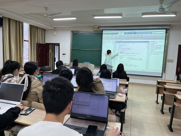 王成老师先进行了《脑电数据分析:理论与MATLAB实操》两课时的课程教学。王成老师带着学生走进代码,在课程中,结合脑电分析、实频分析、ERP分析,以现场制图为例,讲解之后现场指导学生进行实操。通过理论加实践的方式,加深同学对课程内容的掌握,并运用到具体研究里。