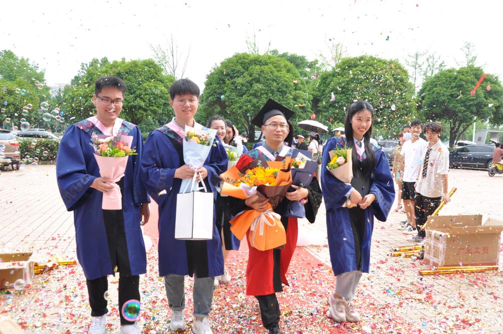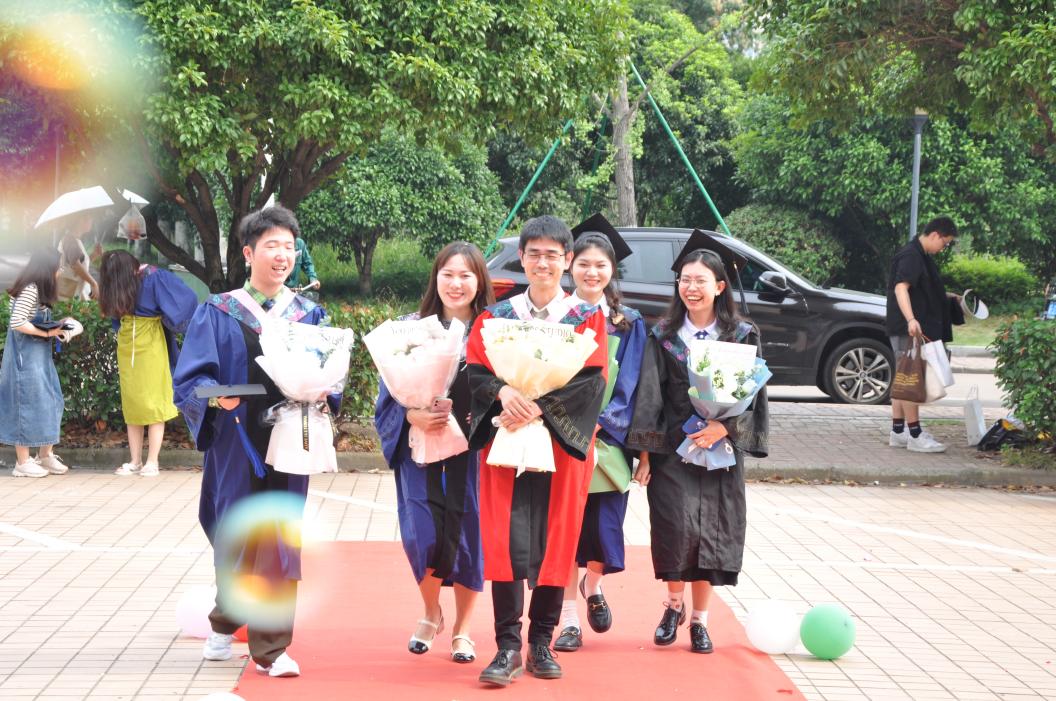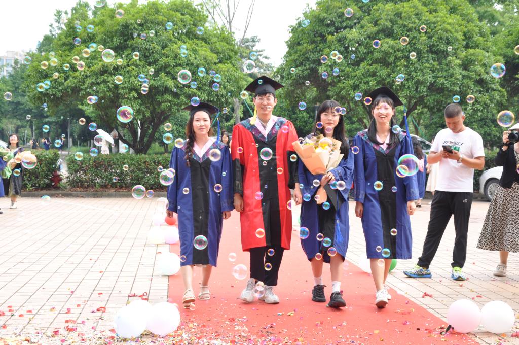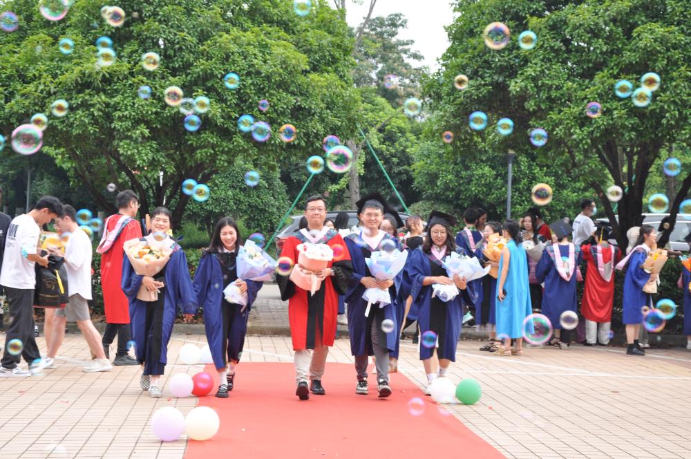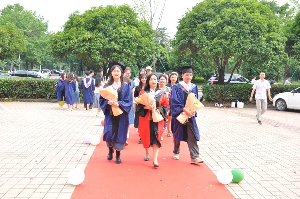 迎朝阳,走花路。典礼开始前,毕业生在导师、班主任的带领下、在广大同学的欢乐与祝福中,昂首走上心理红毯,接受礼炮的洗礼,冲过五彩的气泡墙,并在大门口的展板边签字合影。炮声隆隆,庆贺走下四年时光;彩带飞舞,指向无尽未来