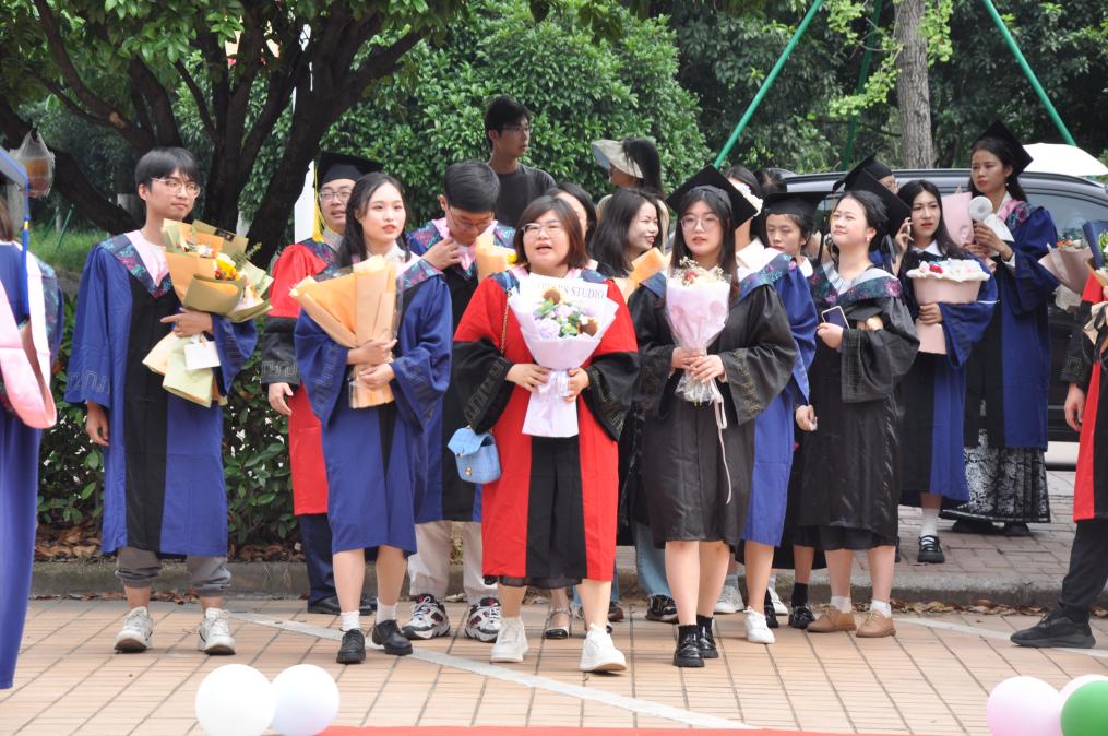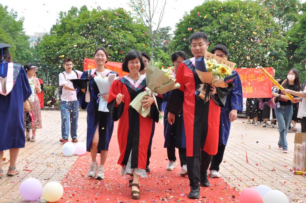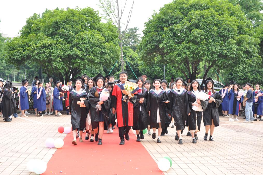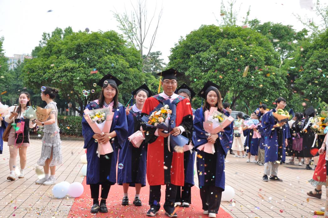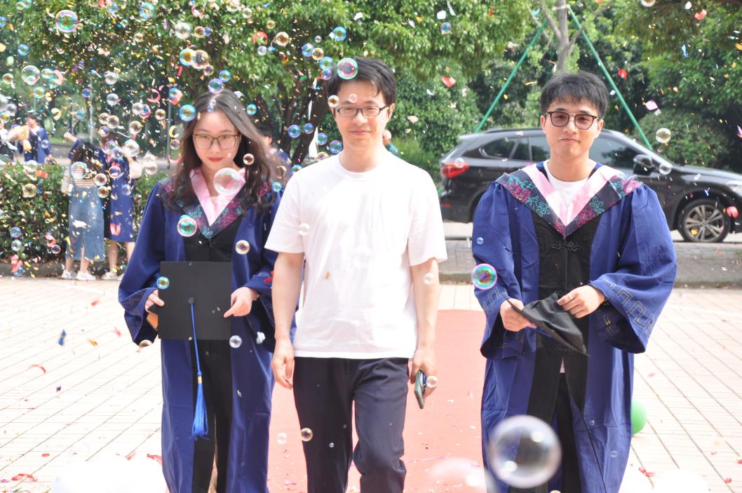 迎朝阳,走花路。典礼开始前,毕业生在导师、班主任的带领下、在广大同学的欢乐与祝福中,昂首走上心理红毯,接受礼炮的洗礼,冲过五彩的气泡墙,并在大门口的展板边签字合影。炮声隆隆,庆贺走下四年时光;彩带飞舞,指向无尽未来