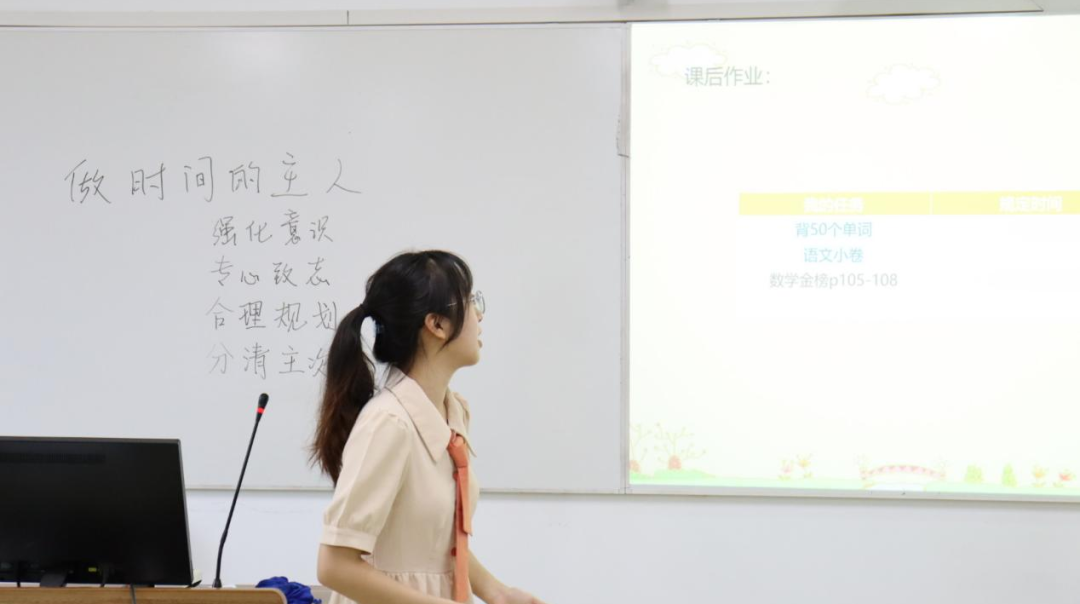 模拟课堂环节中,选手们的表现更是异彩纷呈。2号选手陆昱冰将“解决问题的方法”比作“雨滴”、将“学生们的目标”比作“大树”、“学习上的问题”比作“丢失的一角”,把问题当做成长的机会,雨滴会从丢失的一角滋润大树;10号选手张银秋的主题是“做时间的主人”,她通过对案例的分析,在与学生互动中教会学生时间管理的能力。
