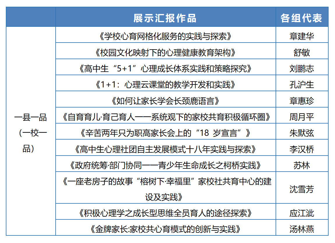 在结业仪式前,进行了两部分的汇报。首先是各小组学员代表进行一县一品(一校一品)个人汇报(如下表)。学员结合自己的心理教育主张,在专家的指导下不断打磨形成所在地的品牌方案。其次是进行家庭教育系列微课成果展示。李伟健和孙炳海充分肯定学员的展示,并提出了期望。随后,李伟健与俞国兴校长为各位优秀学员颁发证书。