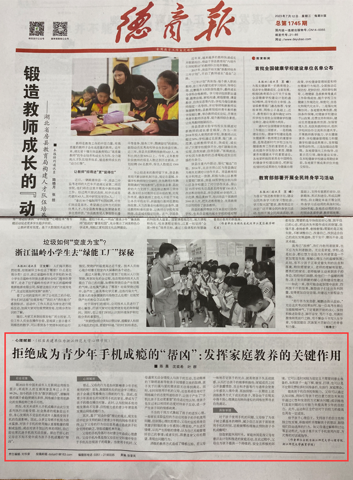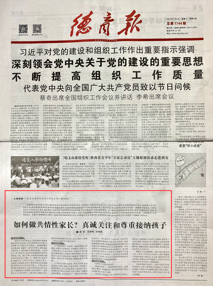 我院研究生武莹、范丽婷等人于7月5日在《德育报》刊出“如何做共情性家长?真诚关注和尊重接纳孩子“心理赋能科普论文。这是全讯600cc大白菜官网和《德育报》开展战略合作开设心理赋能专栏后,刊登的首篇文章,自此每期将刊发一篇由全讯600cc大白菜官网提供的心理赋能文章。