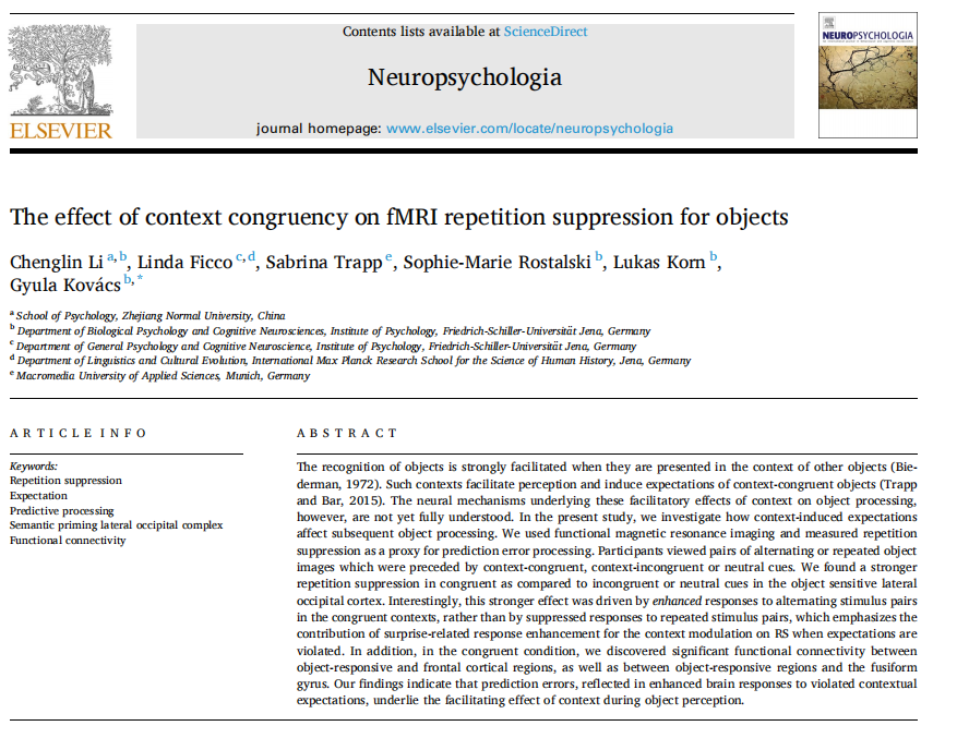 论文来源:Li, C., Ficco, L., Trapp, S., Rostalski, S. M., Korn, L., & Kovacs, G. (2023). The effect of context congruency on fMRI repetition suppression for objects. Neuropsychologia.