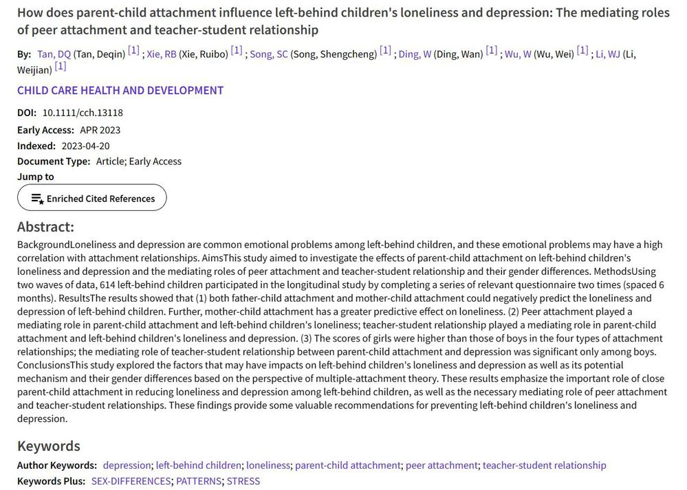 论文来源:Tan, D., Xie, R., Song, S., Ding, W., Wu, W., & Li, W. (2023). How does parent–child attachment influence left-behind children's loneliness and depression: The mediating roles of peer attachment and teacher–student relationship. Child: Care, Health and Development.