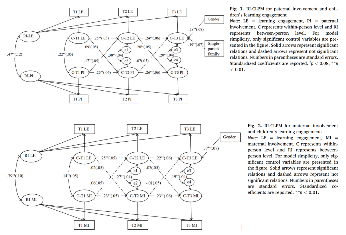 儿童学业表现一直是家长和教育者们关注的重点话题。小学中年级儿童正处于他律阶段,其学习投入很大程度上受到父母的影响。同时,容易被我们忽略的是父母如何对待孩子也是受到儿童学习投入的影响的。儿童与家长之间的相互影响可能会构成循环,进而影响整个家庭的发展。基于此,本研究构建了随机截距的交叉滞后模型(Random intercept cross-lagged model, RI-CLPM),通过分离个体间与个体内成分,分别探讨了父亲教养投入、母亲教养投入与儿童学习投入间的双向关系以及父母角色不同在其中的差异。结果显示在个体内水平,父亲教养投入与儿童学习投入之间存在双向的正向预测的关系,母亲教养投入与儿童学习投入之间不存在双向关系。相较于父亲,母亲教养投入与孩子学习投入之间的关系更像是一种“特质性”的联系。结果提示父亲在儿童学习中可能扮演着更重要的角色,父亲在儿童平时生活以及学习中更多的投入(例如陪伴孩子玩耍、教导孩子规则、辅导孩子作业)有助于孩子的学业发展,同时也要注意到孩子对父亲投入的影响,避免在孩子学业表现不好时减少对孩子的关注。本研究的发现强调了父亲教养投入与孩子学习投入之间独特的相互影响的关系,为儿童的学习投入与家庭的和谐发展提供了启示。