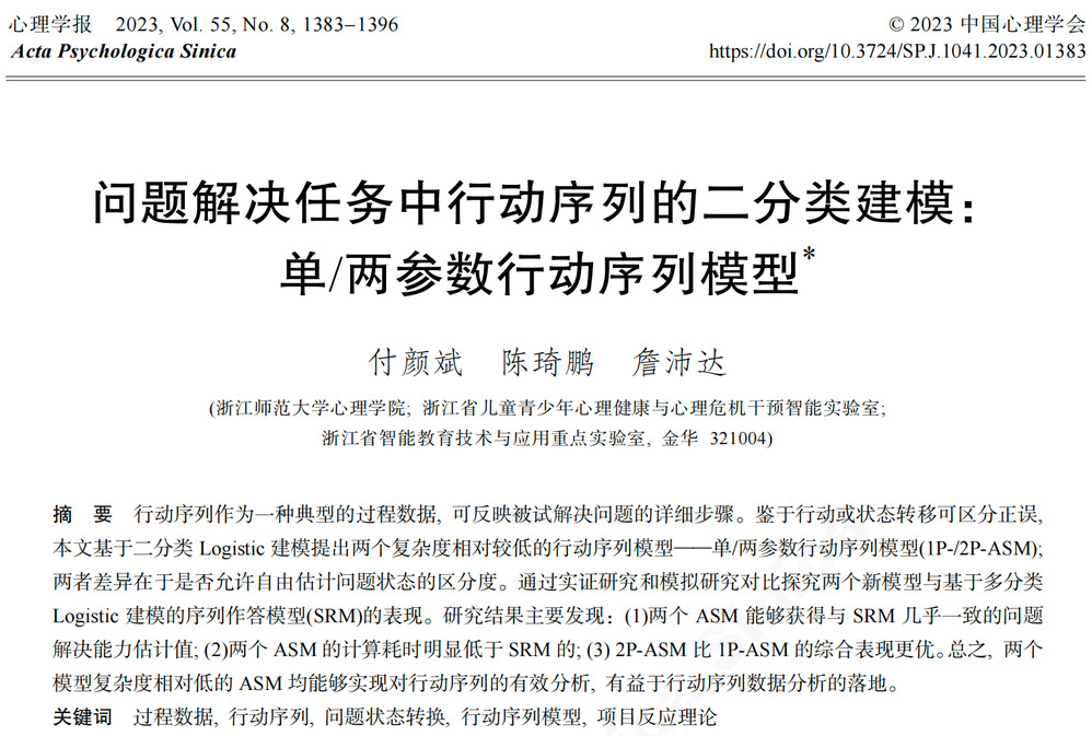 论文来源:付颜斌, 陈琦鹏, 詹沛达. (2023). 问题解决任务中行动序列的二分类建模:单/两参数行动序列模型. 心理学报, 55(8), 1383-1396.
