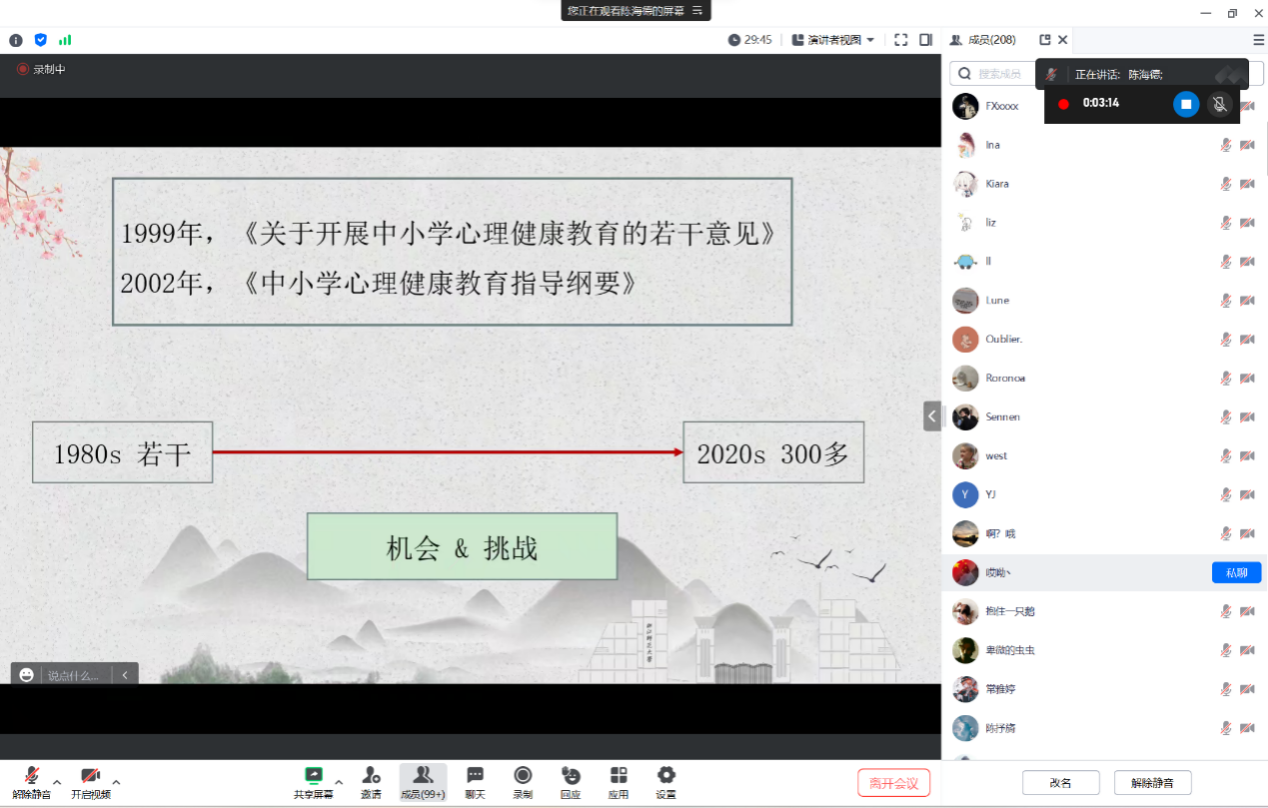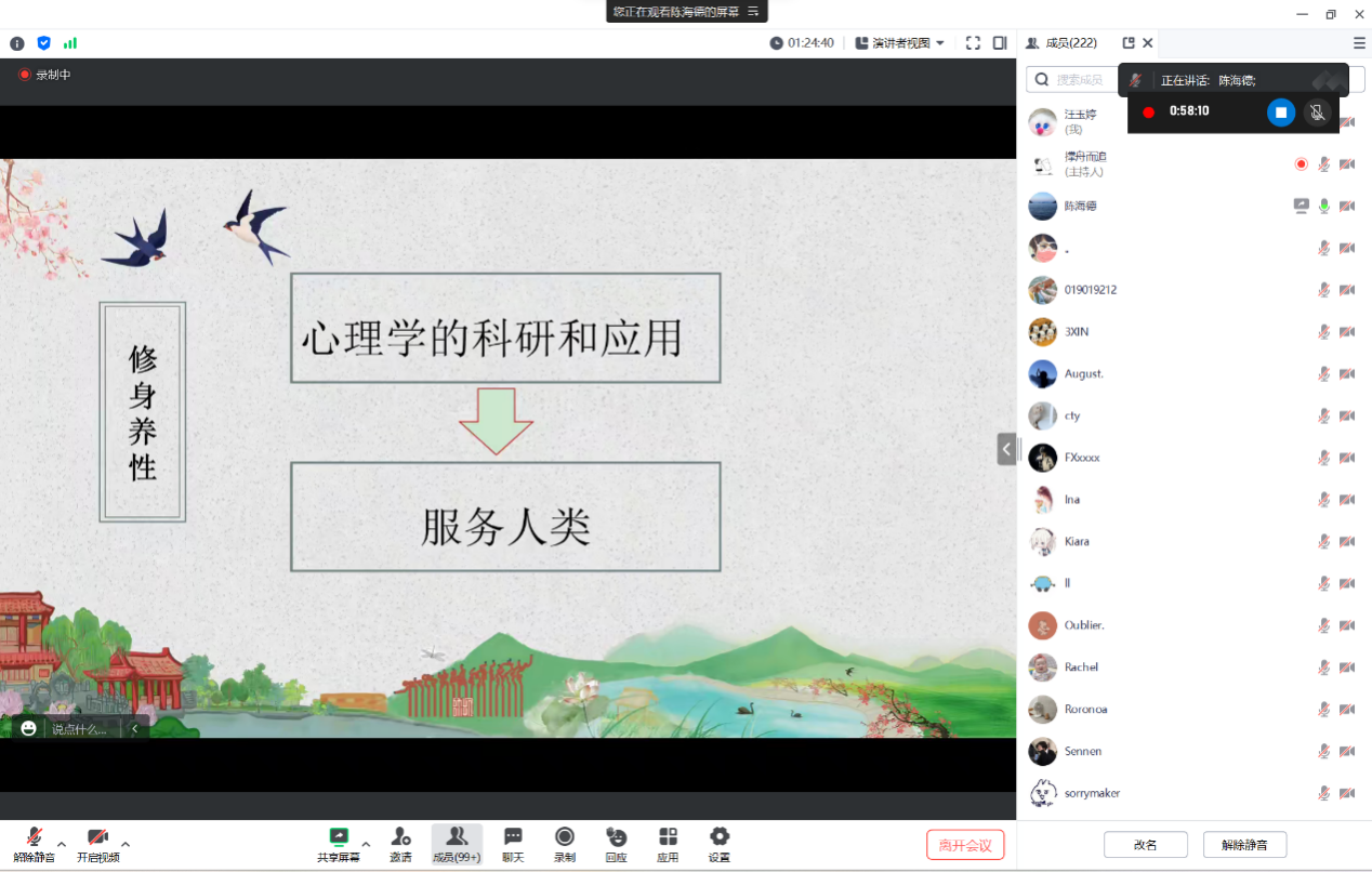 在第三部分,陈海德老师提出心理学的科研和应用最终服务于人类,以心理咨询师的职责和胜任力为例,探讨了心理学专业学生如何做到以人为本,指出心理学子应当拥有良好的利他价值观,站在广义的角度服务他人、服务国家、服务社会。此外陈海德老师指出心理学专业学生也需增强自身心理素质,理解和维护自身的心理健康。