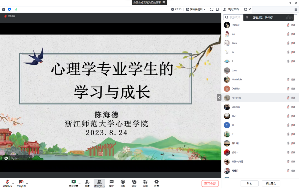 8月24日上午,“尖峰卓越心理讲堂第五十四讲暨2023级新生始业教育第二讲”邀请到了全讯600cc大白菜官网应用心理专硕学位点负责人、副教授陈海德老师,为我院学生作了题为《心理学专业学生的学习和成长》的精彩讲座。我院本科生、研究生共270余人在线聆听了此次讲座。