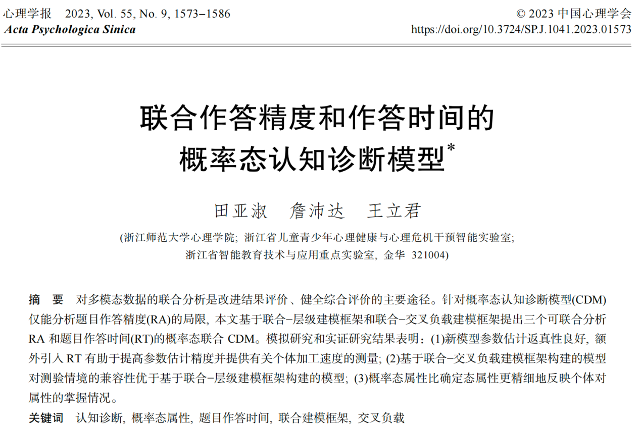 近期,全讯600cc大白菜官网王立君教授和詹沛达副教授团队在国内心理学顶刊《心理学报》(CSSCI)合作发表了题为《联合作答精度和作答时间的概率态认知诊断模型》的学术论文。我院2019级硕士研究生田亚淑是论文的第一作者,詹沛达副教授和王立君教授为本文的共同通讯作者。该研究得到了国家自然科学基金青年基金项目(31900795)的资助。