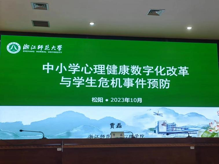 同在10月,贾磊副院长参加了“山海虽远、心理共富、笃行必达 山区海岛县师生心理服务行动松阳专场暨学校心理健康教育推进会”并开展了《中小学学生心理健康数字化改革与学生危机事件预防》讲座。讲座包括新形势下学生危机事件的预防以及解读中小学心理健康教育数字化改革两部分,贾磊副院长系统介绍了心理危机的预防策略,学生心理健康问题如何预防、筛查、评估等问题,希望通过家—校—社协同共育,实现1+1+1>3的倍增效应。会后,他们还一起参观了松阳县第一中学心理辅导中心,并沟通交流了学校心理健康教育工作相关布置。