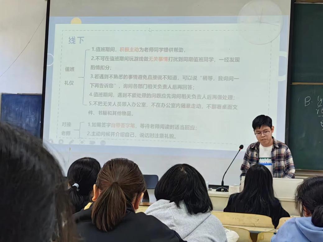 本次会议内容分为三个部分:礼仪规范、公文规范、学风建设。会议旨在提升学生干部干事办事能力,增强凝聚力,建设学风优良的学生组织。