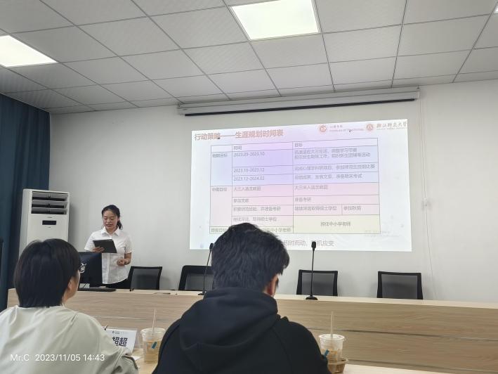 11号选手樊文悦的目标是中学心理健康教师。她从兴趣、性格与技能优势三方面分析自身与目标的匹配度,汇报了参与支教、进行教育实习、策划比赛、参加制定心理团辅等一系列行动成果,最后进行自我评估总结并说明个人与目标契合度高的未来规划。