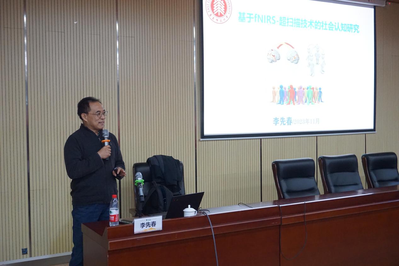 11月15日晚,“尖峰卓越心理讲堂第七十讲”邀请到了华东师范大学心理与认知科学学院教授、博士生导师李先春老师,为我院师生作了题为《基于fNIRS-超扫描技术的社会认知研究》的精彩讲座。本次讲座由全讯800cc大白菜应用心理学专硕学位点负责人詹沛达老师主持,我院本科生、研究生和教师100余人到场聆听了此次讲座。