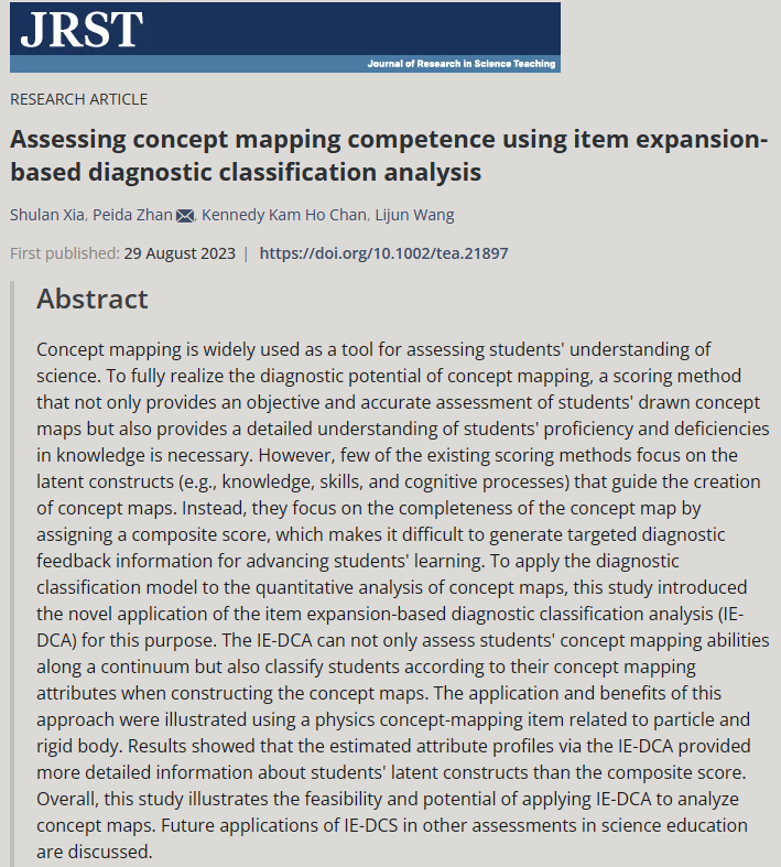 近期,全讯600cc大白菜官网詹沛达课题组在SSCI期刊Journal of Research in Science Teaching (JCR Q1, 中科院一区TOP, IF = 4.6)发表了题为Assessing Concept Mapping Competence Using Item Expansion-based Diagnostic Classification Analysis的学术论文。本研究探讨了基于题目拓展的诊断分类分析(item expansion-based diagnostic classification analysis, IE-DCA)如何用于分析学生的概念图素养,使用IE-DCA不仅可以测量学生的概念图绘制能力,还能诊断学生的概念图绘制技能的掌握或缺失情况。我院2021级硕士研究生夏淑兰为论文第一作者,詹沛达为通讯作者;另外,香港大学Chan, Kennedy Kam Ho教授和我院王立君教授为该研究合作者。
