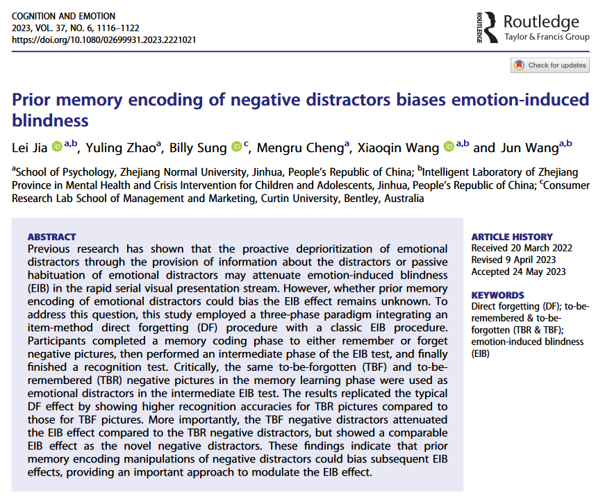 论文来源:Jia. L., Zhao Y., Sung, B., Cheng, M., Wang, X., & Wang, J. (2023) Prior memory encoding of negative distractors biases emotion-induced blindness. Cognition and Emotion, 37(6), 1116-1122.