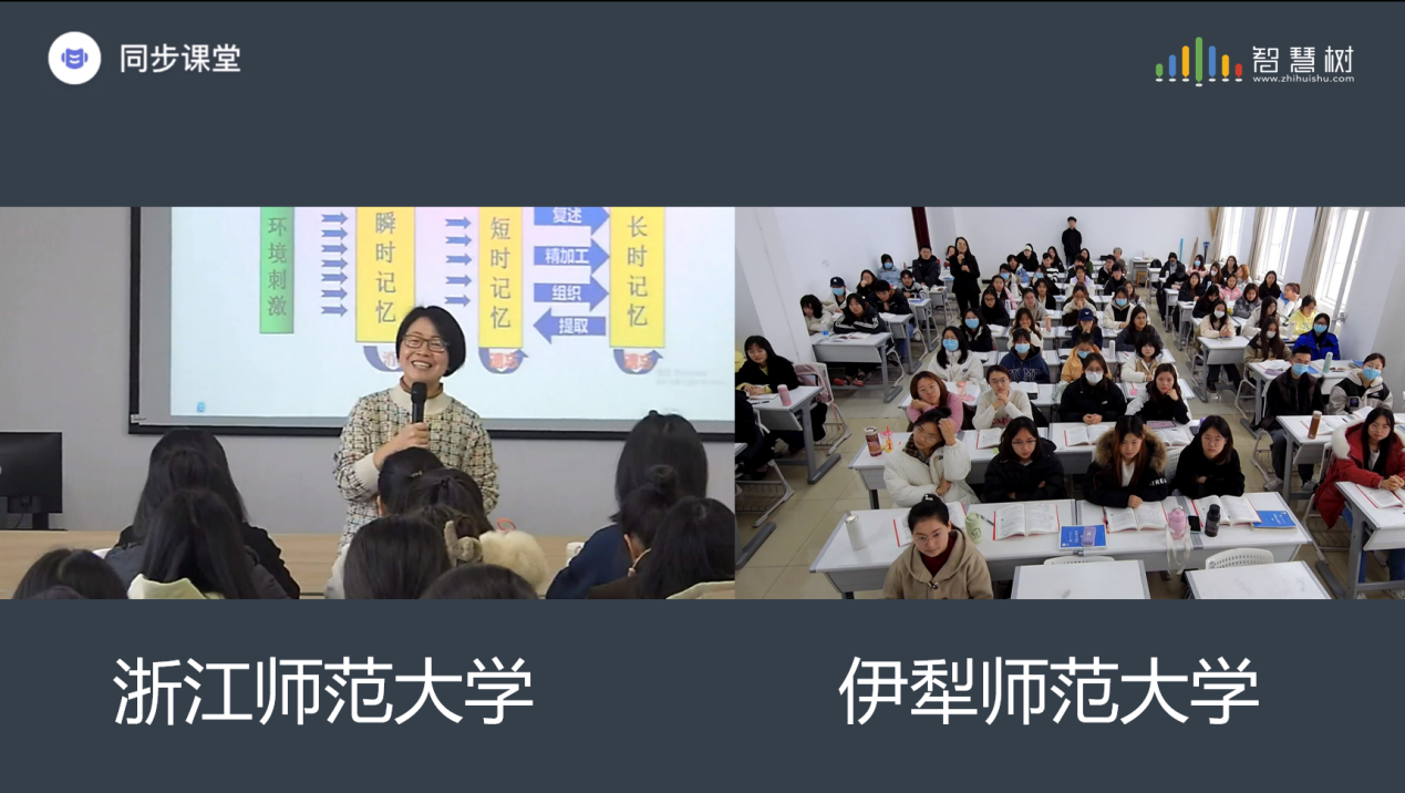 在同步课堂教学过程阶段,授课教师姚静静博士以“琳琳的学习困惑”案例为导入,引发学生思考与小组探讨,引出学习策略的学习与应用主题。姚静静现场讲授并示范了组织、精细加工等学习策略,并且连线邀请伊犁师大肖冰玉、周毅同学回答提问。接着,三个学生小组分别就复述策略、精细加工策略和组织策略的知识点及实际应用进行了课堂汇报。姚静静逐一指导点评,肯定小组合作的努力与成效,同时进行了课堂小结,布置课后实践任务。两地课堂互动气氛活跃,云端实时问答“零距离”交流,有效促进了学生的认真思考和对知识的融会贯通。