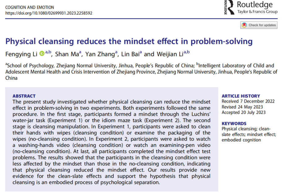 论文来源:Li, F., Ma, S., Zhang, Y., & Li, W. (2023). Physical cleansing reduces the mindset effect in problem-solving. Cognition and Emotion.
