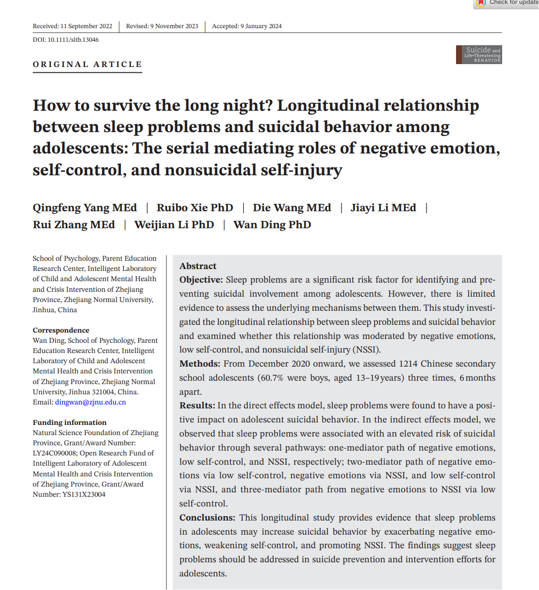 我院2021级硕士生杨青风为论文的第一作者,丁菀副教授为本文通讯作者,李伟健教授为本文的合作作者。该研究得到了浙江省自然科学基金探索项目(LY24C090008)和浙江省青少年心理健康与危机干预智能实验室开放研究基金(YS131X23004)的资助。论文来源:Yang, Q., Xie, R., Wang, D., Li, J., Zhang, R., Li, W., & Ding, W*. (2024). How to survive the long night? Longitudinal relationship between sleep problems and suicidal behavior among adolescents: The serial mediating roles of negative emotion, self-control, and nonsuicidal self-injury. Suicide and Life‐Threatening Behavior.文章链接:https://doi.org/10.1111/sltb.13046