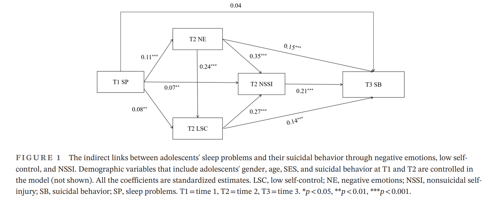 近期,全讯600cc大白菜官网丁菀、李伟健教授团队在国际期刊Suicide and Life-Threatening behavior (JCR Q2; IF = 3.2)在线发表了题为How to Survive the Long Night? Longitudinal Relationship Between Sleep Problems and Suicidal Behavior Among Adolescents: The Serial Mediating Roles of Negative Emotion, Self-control, and Nonsuicidal Self-injury的学术论文。该研究提供了睡眠问题与青少年**行为间的纵向证据,表明青少年的睡眠问题可能通过加剧负面情绪、削弱自我控制和促进非**性自伤而增加**行为。