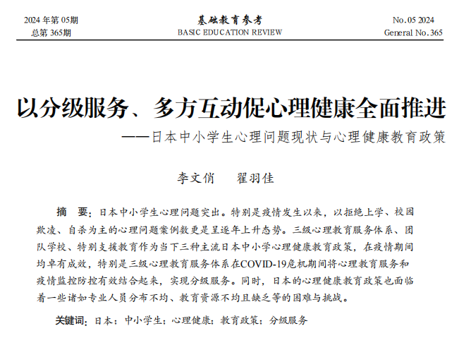 论文来源:李文俏, 翟羽佳. (2024). 以分级服务、多方互动促心理健康全面推进——日本中小学生心理问题现状与心理健康教育政策. 基础教育参考, 365(05).