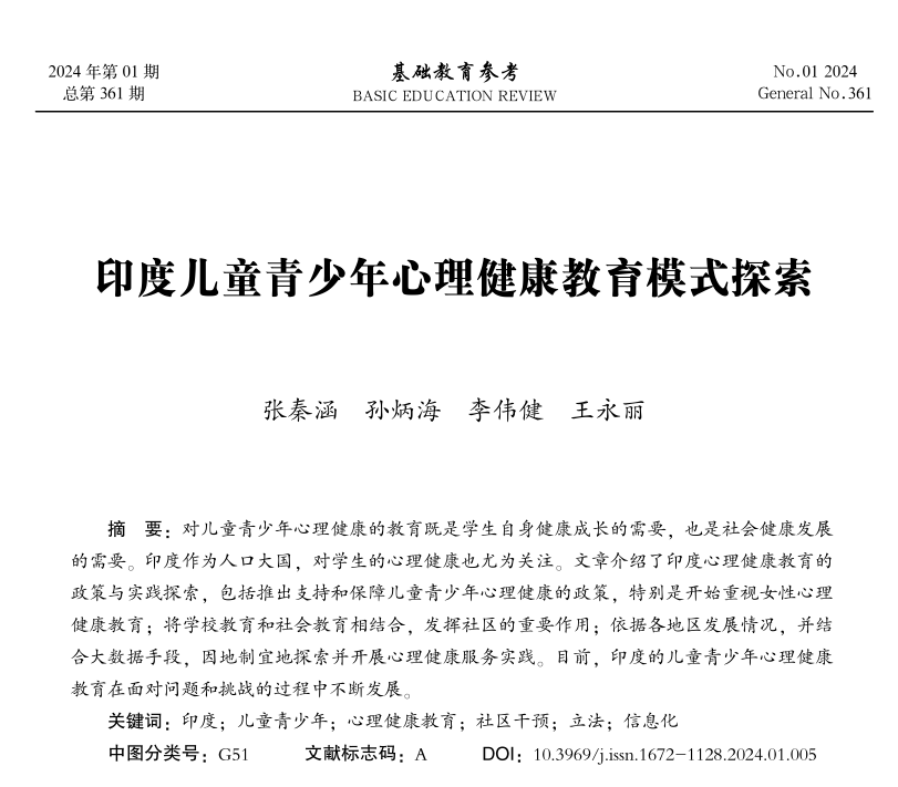 论文来源:张秦涵, 孙炳海, 李伟健, 王永丽. (2024). 印度儿童青少年心理健康教育模式探索. 基础教育参考, 361(01), 61-70.