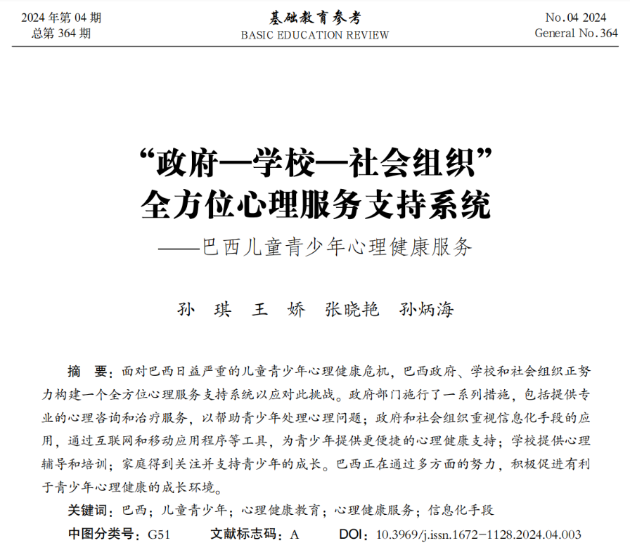 论文来源:孙琪, 王娇, 张晓艳, 孙炳海. (2024). “政府—学校—社会组织”全方位心理服务支持系统. 基础教育参考, 364(04),27-37.