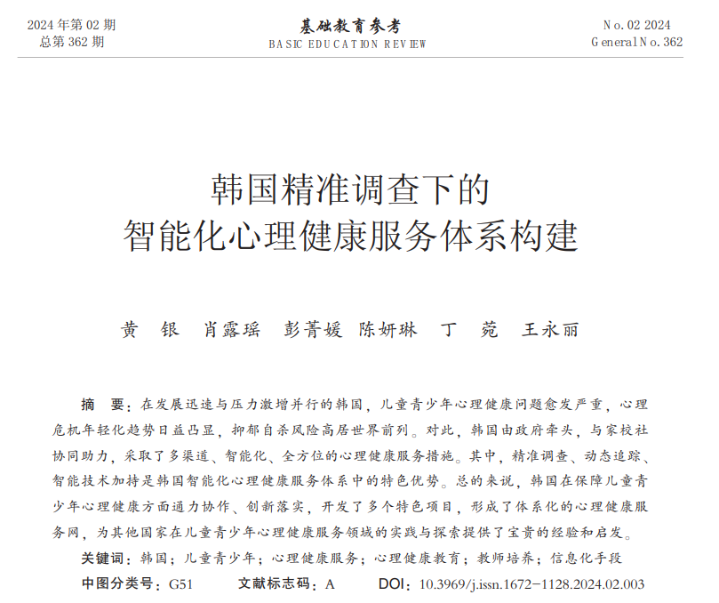 论文来源:黄银, 肖露瑶, 彭菁媛, 陈妍琳, 丁菀, 王永丽.(2024). 韩国精准调查下的智能化心理健康服务体系构建. 基础教育参考, 362(02), 20-32.
