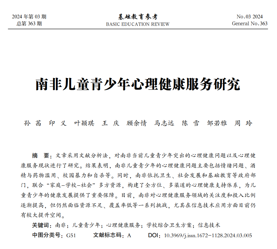 论文来源:孙茜, 印义, 叶颖琪, 王庆, 顾余情, 马志远, 陈雪, 邹若雅, 周玲. (2021). 南非儿童青少年心理健康服务研究. 基础教育参考, 363(3), 46-60.