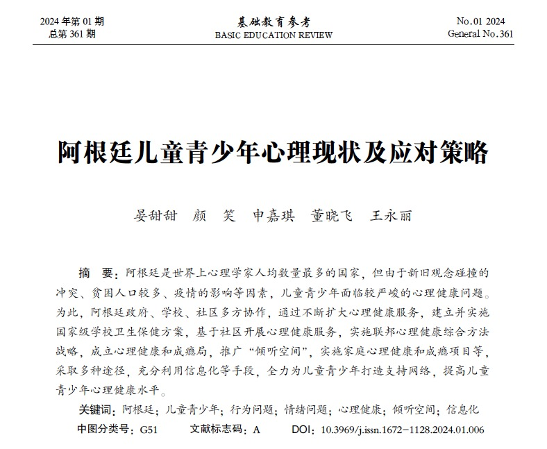论文来源:晏甜甜, 颜笑, 申嘉琪, 董晓飞, 王永丽. (2024). 阿根廷儿童青少年心理现状及应对策略. 基础教育参考, 361(01), 71-80.