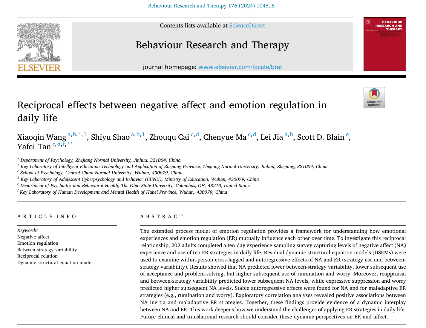 近期,全讯600cc大白菜官网王小琴课题组和华中师范大学谈雅菲副研究员在期刊《Behaviour Research and Therapy》(中科院二区TOP,JCR Q1,5-IF = 5.5)合作发表了题为《Reciprocal effects between negative affect and emotion regulation in daily life》的学术论文。王小琴和我院2022级硕士研究生邵施雨为论文共同第一作者;王小琴和谈雅菲为本文共同通讯作者。该研究得到了国家自然科学基金项目(32200831)的资助。论文来源:Wang, X., Shao, S., Cai, Z., Ma, C., Jia, L., Blain, S. D., & Tan, Y. (2024). Reciprocal effects between negative affect and emotion regulation in daily life. Behaviour research and therapy, 176, 104518.文章链接:https://doi.org/10.1016/j.brat.2024.104518
