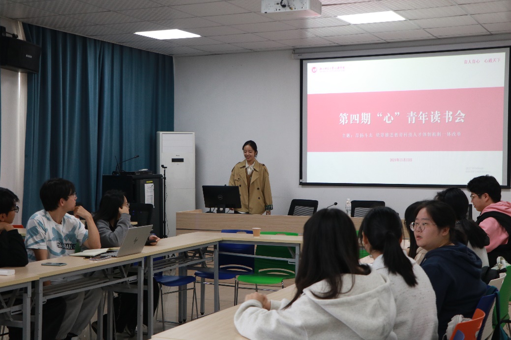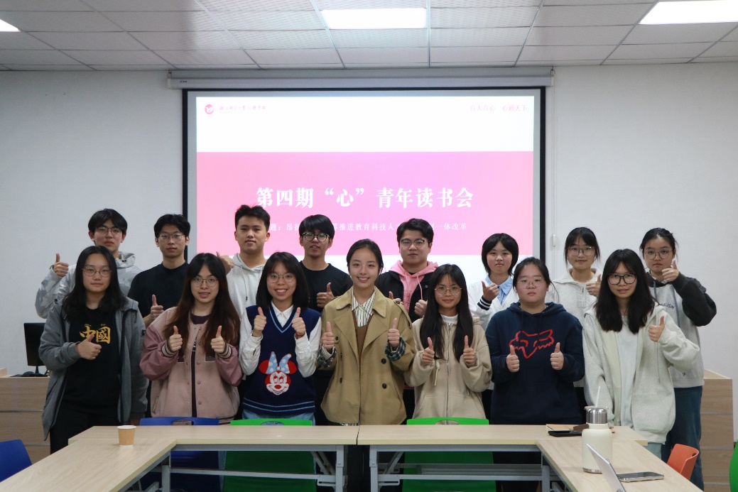 11月13日中午,全讯600cc大白菜官网举行了第四期“心”青年读书会。本次读书会以《昂扬斗志,统筹推进教育科技人才体制机制一体改革》为主题,活动由学生会主席黄瑞瑜主持。学工办辅导员柏战老师出席会议,学院团委学生会主席团、学生会科研部、团务中心青大队全体成员参加会议。