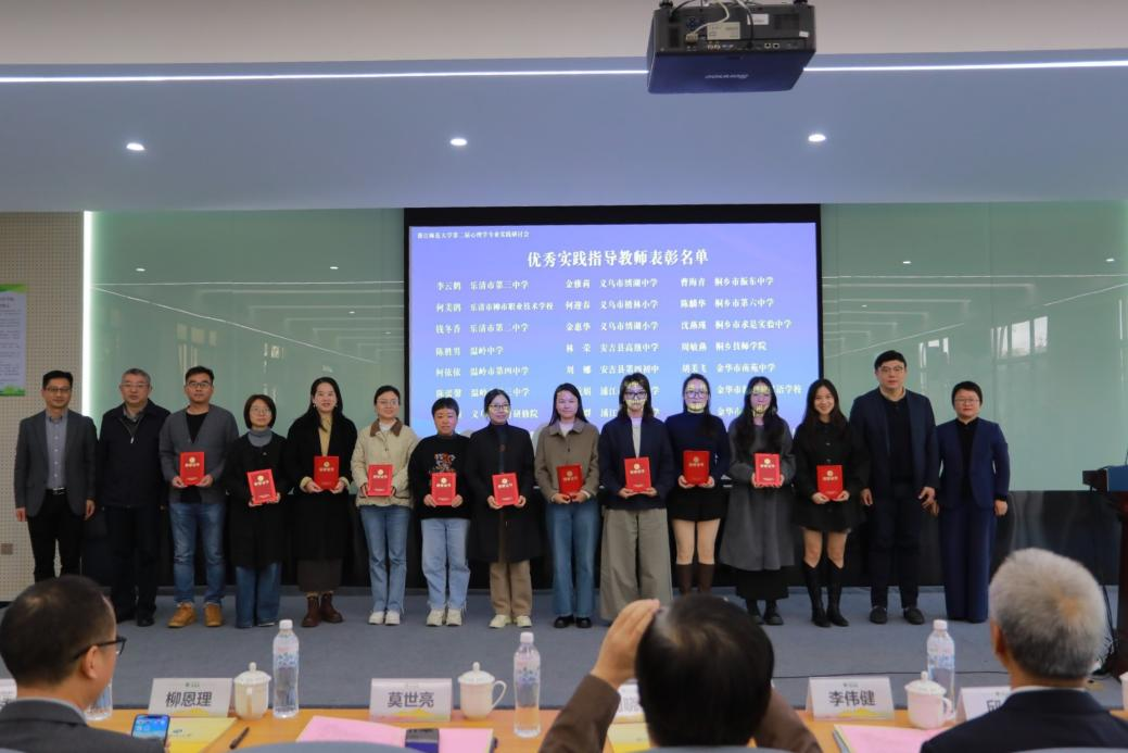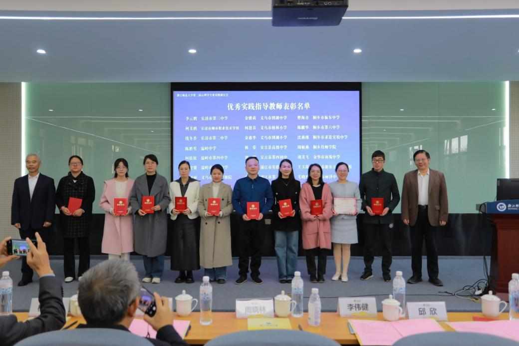 周晓林、李伟健、邱欣和莫世亮为李云鹤、何美鹃、钱冬香、陈胜男等27位教师颁发优秀实践指导教师奖。